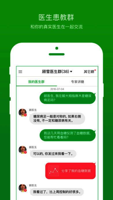 “你的医生”平台已有5000+名三甲医院内分泌医生入驻,患者加入现实面诊医生所在群,在群中接收系统化的糖尿病教育以及医生随时随地的血糖指导建议。
