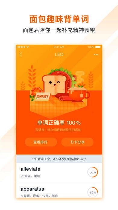 面包君可爱形象陪你背单词,不同烘焙程度的精美面包卡片带你开启完美学习的一天。