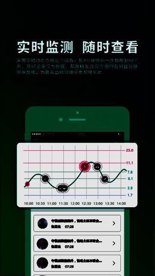 采用实时动态血糖监测设备,通过蓝牙传输到APP中,帮助糖友随时看到自身糖尿病数据,为自我血糖管理提供数据帮助;