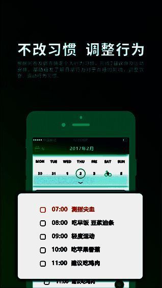 一对一医生随诊,异常情况线上、线下干预。为糖友提供私人医生服务,帮助糖友自身的数据,为糖友提供定制建议。根据糖友的饮食、运动习惯,配合动态数据分析,为糖友提供4周定制饮食、运动建议。帮助糖友了解自己如何吃、如何运动;