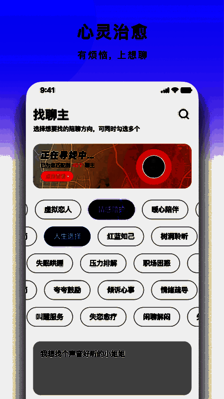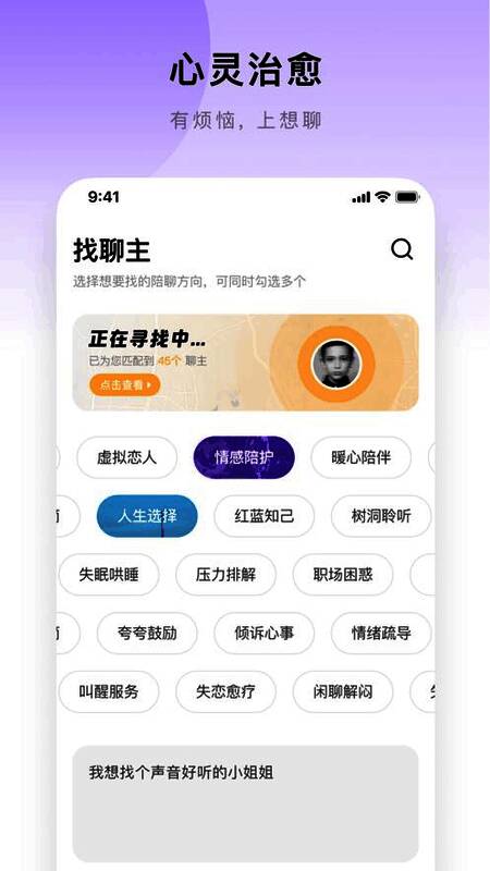 想聊app是一款语音社交软件,现社会年轻人的压力越来越大,很多烦恼都无处释放,想说的话找不到人聊,开心的事找不到人讲,想聊app的诞生就是为了解决这一问题,在这里你可以将你的任何事情诉说出来,这里有很多心地善良的小伙伴帮你解除烦恼,开心的事情与大家一起分享,想聊app里面还有很多新鲜有趣的小游戏,让你能更好的与朋友互动,喜欢唱歌也可以分享你的好声音,用你甜美温暖的声音打动他,说不定在这里很快就能找到属于你的另一个TA。