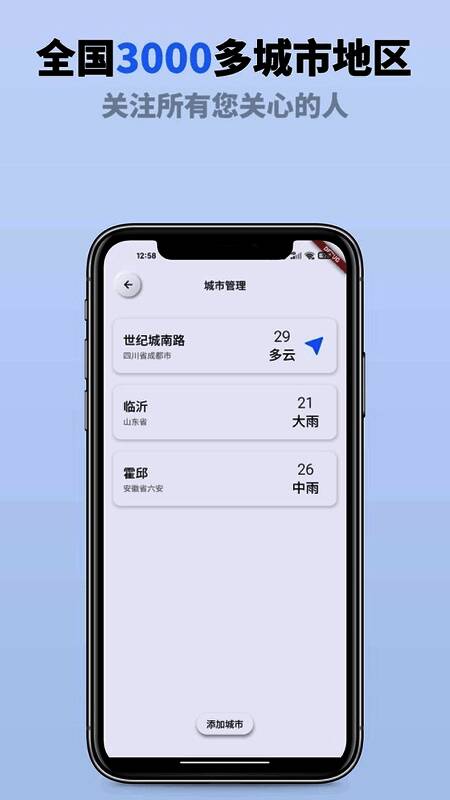 通过这个软件,你可以第一次了解天气和温度的变化,PM2.5的空气质量会随着时间的推移而变化,一旦有风吹草动,你可以立即查询。我们可以同时将多个不同的城市添加到您的手机中,这样您就可以在不切换的情况下立即了解相关的不同场景,您还可以添加需要在软件上完成的各种任务