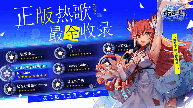 1、《命运歌姬》是一款精品二次元风的音乐类游戏,超丰富正版V家名曲、动画OPED在等你哦,在这里你更可以与歌舞姬深度互动,在异世界中召唤心中的歌舞姬,和TA一起成长,找回失落的记忆。