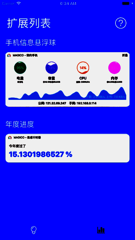 1、详细的展示设备的信息内容,多种不同的小组件,自定义进行悬浮球的扩展。
