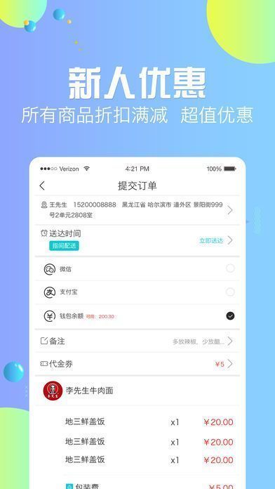 外卖订餐,新用户立减5元,20减12,0配送,更多红包等你来拿;