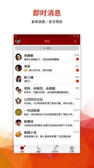 1、极致的工作沟通方式:企业IM、文件、语音、图片以及实时电话会议,快速的沟通方式,极大地提升协同办公效率;