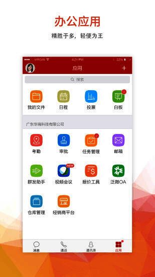 3、统一的移动办公入口:丰富的移动办公应用接入,签到、考勤、邮箱、公告、审批等,应有尽有;