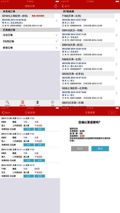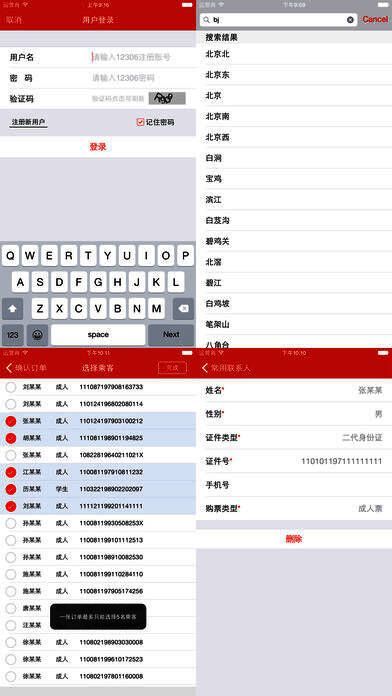 4、订票,支持多人同时订票,在订票页面可以直接从常用联系人中选取订票人,方便、快捷;