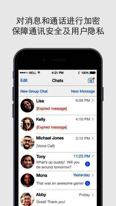 4、隐私:所有消息在发送之后即被永久删除,未成功发送的消息七天之后即会过期且被永久删除。删除的消息我们从不在服务器或者任何云端进行储存。