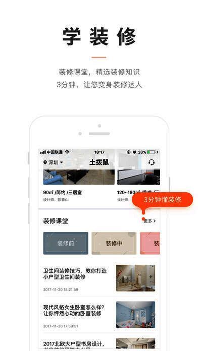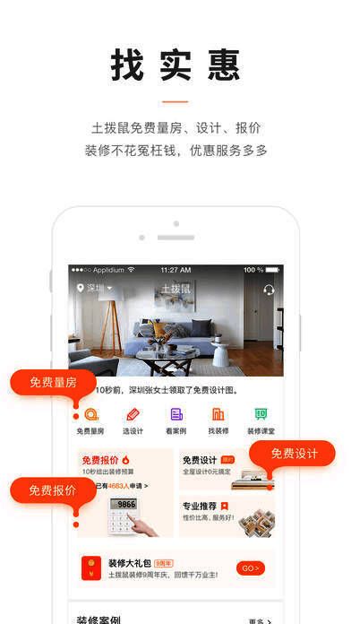 土拨鼠装修app是专为家居装修打造的应用,涵盖全国绝大多数城市,能随时查看海量装修效果图,在线预约装修上门装修服务,是您家居装修的好帮手。
