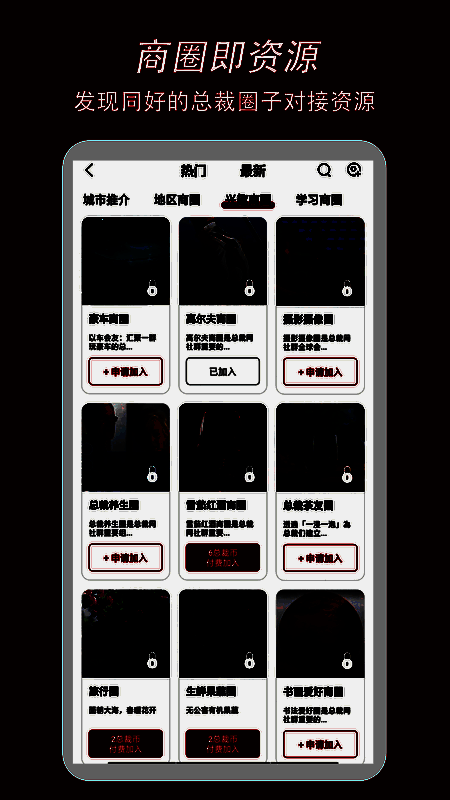 总裁网app是一款专为广大总裁级人士打造的社交圈子,不论是赋能总裁和想成为总裁的人都可以参与进来,提供专属圈子社区,可以进来学习、讨论、发现商圈、拓展人脉,将全球总裁连接在一起;在这里,圈子既是资源,你可以发现同好的总裁圈子对接资源,也可以创建圈子,遇见更多和你一样志趣相投的人;在总裁网平台,其中包含了多种类型圈子,动态、视频、商圈、人脉、话题、商学院、社交等等都有,投其所好,不论是结交新朋友还是寻找合作伙伴都可以,对你有帮助的话就来下载这款总裁网app苹果版使用吧。