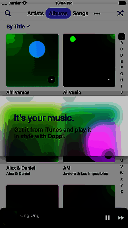 Doppi APP是一款手机音乐播放软件,Doppi只支持播放音乐,音乐的资源需要你在iTunes下载哦,不过这款播放器使用起来还是蛮舒适的,你导入的所有音乐都会按照歌名首字母进行排序,播放的方式也有很多种,使用起来都是非常方便的,需要的小伙伴快来下载。