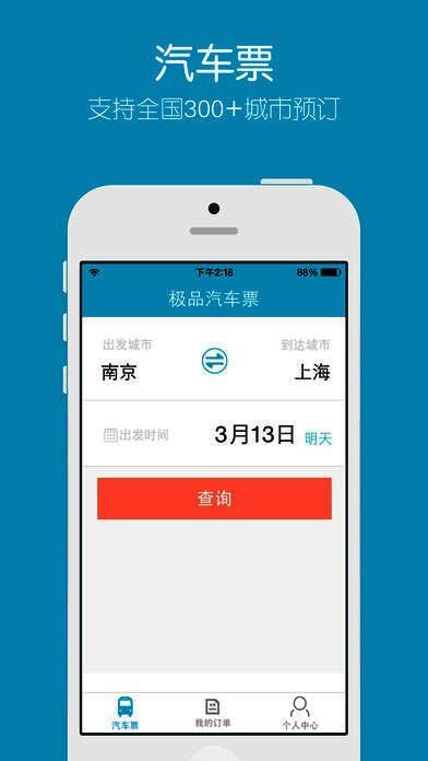 2、汽车票预订,支持300多个城市直接预订;