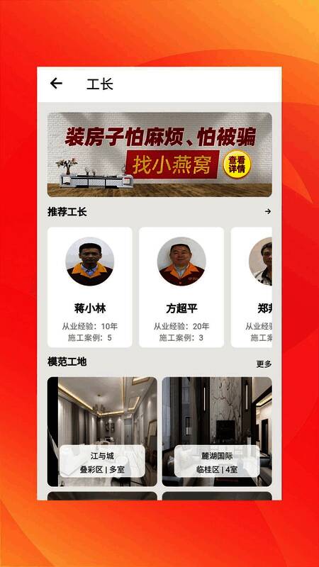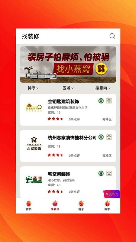 《小燕窝》是一款可以来全面负责家庭装修的手机服务软件。在这款软件之中,可以来直接线上联系软件之中的工作人员,到家后可以来根据自己的喜好以及工作人员专业的看法来对自己额新家进行装修,装修的成品绝对的符合大家的期待哟!感兴趣的小伙伴们赶快来下载体验吧!