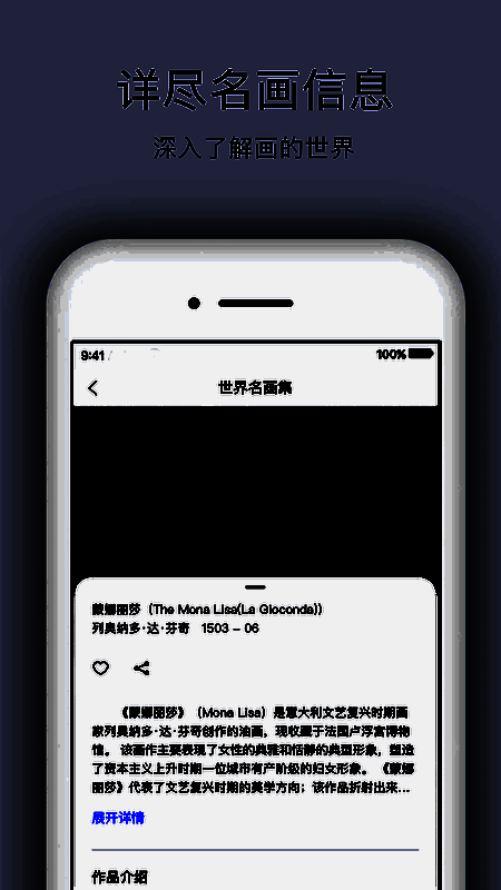 《世界名画集》是一款在自己的手机上面就可以看到让大家心动的名画作品啦。在这款软件之中可以来看到一幅幅远近闻名的名画。可以来通过高清的照片看到每一张名画的细节,旁边还有着对于这幅名画的解析和说明,这就是艺术!感兴趣的小伙伴们和赶快来下载体验吧!