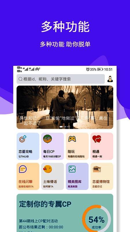 三天情侣处CP是一款有态度优质的社交交友社区客户端,在这里可以学习到谈一场恋爱攻略方法,土味情话让你更有风趣幽默,可以上不断的美女图片分享给到大家,一周CP推荐让你线上线下处CP,在这发现好玩的事有趣的人。