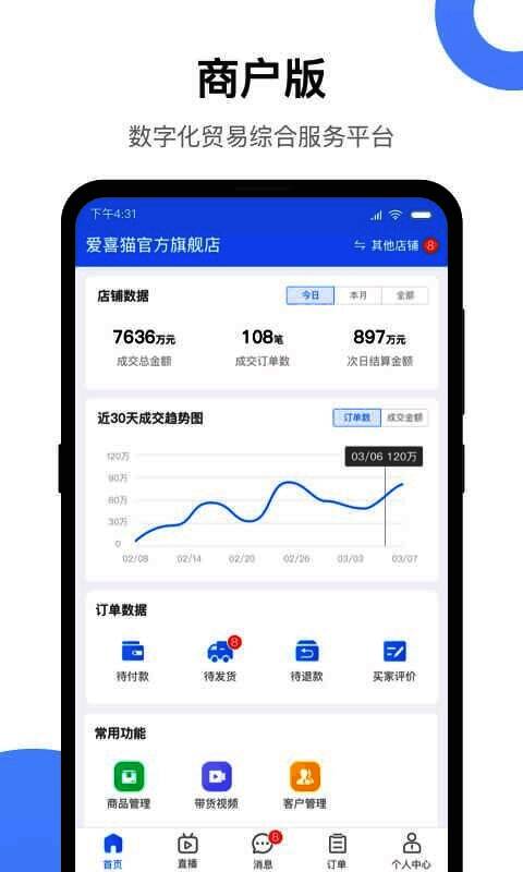 小商品城卖家版专为商家打造,在互联网+时代背景下,整合政府、市场、社会三方资源,一直以用户为主,查看库存信息、顾客订单、营业额、销售数量等相关数据,所有的功能都为用户着想,由义乌中国小商品城大数据有限公司负责开发运营,感兴趣的小伙伴快来下载体验一下吧!