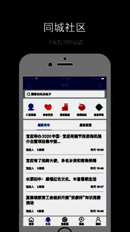 《大宝应》是一款同城服务功能的社区社交交流的平台,在这款为宝应这个地区来提供城市的信息的分享以及发布,而且还可以来在自己喜欢的社区里面进行聊天交流,话题的提出,可以自己来发布喜欢的话题,评论,转发等等!感兴趣的本地小伙伴们赶快来下载体验吧!
