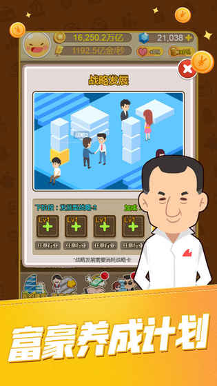 《华尔街大亨》是一款经商题材的卡通风模拟经营手游,玩家将缔造一个属于自己的商业帝国,从一个小公司做起,培养提拔精英人才,出任CEO,迎娶白富美,一切触手可及,你还在犹豫什么?