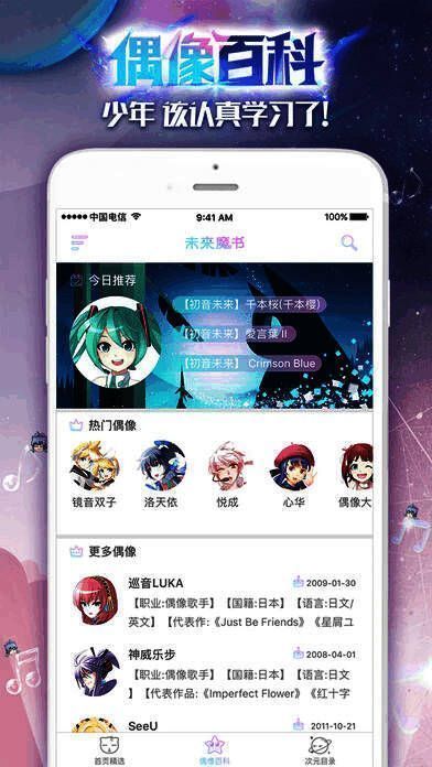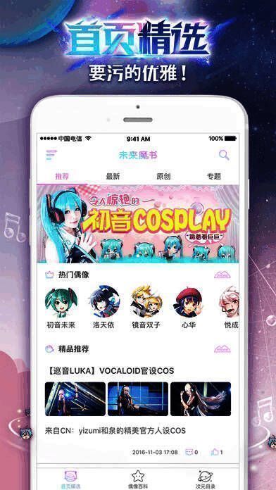未来魔书app是一款专为二次元的朋友们准备的虚拟偶像软件。在这里,您可以了解初音未来,洛天依等等各位虚拟偶像的各种资讯,还可以购各种cd,周边,非常方便!