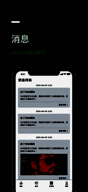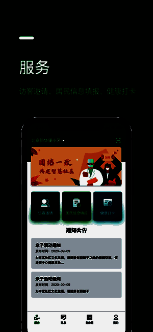 3、电子身份认证,社区活动、健康打卡等综合服务。