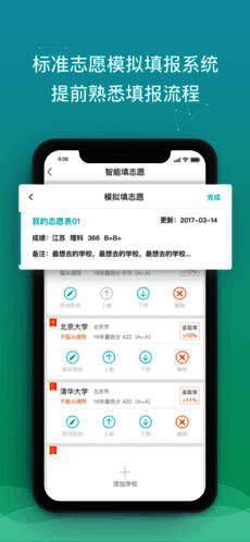 【志愿推荐】我能上什么学校、读什么专业?高考e志愿打破数十年传统纸质填报志愿的模式,在深入分析多年高考投录数据的基础上,采用独立开发的大数据智能分析算法,根据成绩、录取排位、计划数等参数计算出录取概率,智能推荐合适的院校和专业,让考生自选生成多套模拟填报方案;