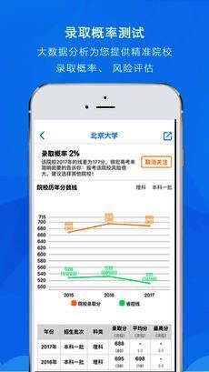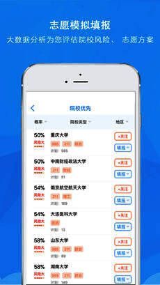 1、用户可进行高考志愿模拟填报,系统结合用户的院校、专业意向和提供的成绩、位次,通过大数据分析对院校、志愿方案进行风险系数评估,并为用户智能推荐本省市、北上广、沿海地区、全国等四套不同区域的志愿填报参考方案;