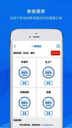 【一键填报志愿】结合用户提供的成绩、位次等,系统为用户智能推荐本省市、北上广、沿海地区、全国等四套不同区域的志愿填报参考方案;