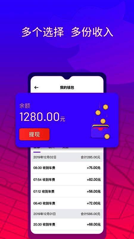进一步丰富司机收入;清晰明了的收入统计,方便司机更好跟踪收入流水;安全合规,值得信赖的跑车平台。