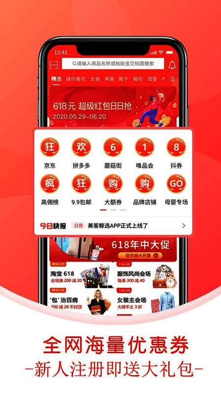 美客鲸选官方app是一款非常不错的一个手机购物平台,受到了很多消费者的喜爱,随时可以手机在线购买自己喜欢的商品,购物非常的便捷,集合了众多电商平台的优惠券,直接在线领取就可以享受优惠,操作简单,还能省钱,这么好的电商软件一定要下载试试!