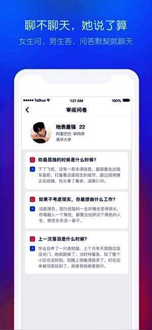 她说是一款在线社交软件,主打女生优先的线上社交圈,你可以使用这款软件结识不少新好友,APP每天还会为你推荐21位与你个性默契度高的小伙伴,助你快速扩大朋友圈,说不定就会遇见那个TA;严格的人工审核,保障所有用户的真实性,拒绝头像虚假、资料虚假、广告虚假以及低俗信息,让你交友更放心;她说APP还会智能为你提供话题,拒绝一日好友。