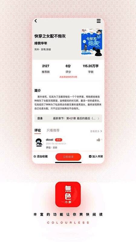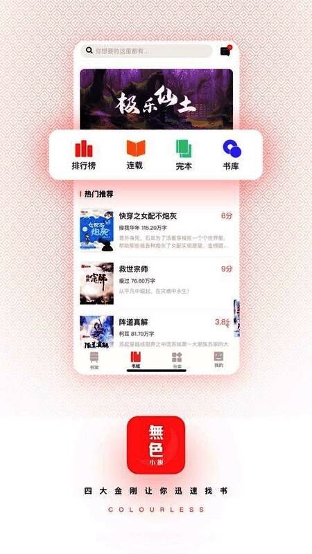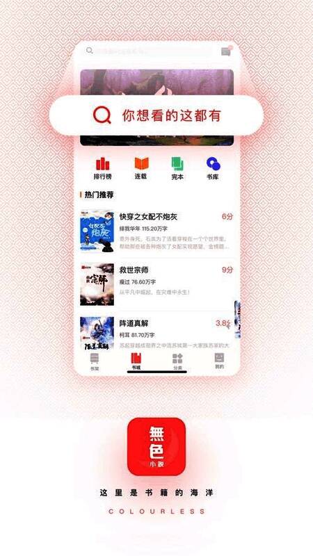 这里,是书籍的海洋!《无色小说》是一款超级不错的的小说阅读神器!是书虫们必备的追更神器!无色小说软件内收录了海量的小说资源,全网第一时间更新,让你追书0等待!最新最热的小说资源为你一网打尽!在线轻松阅读!还能离线缓存!秒速追书就在口袋,随时随地,想看就看,尽情享受阅读小说的快乐!