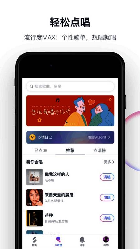 2、众所周知音街是由网易云音乐推出的一款K歌类手机应用,共同来点播您喜欢的曲目。