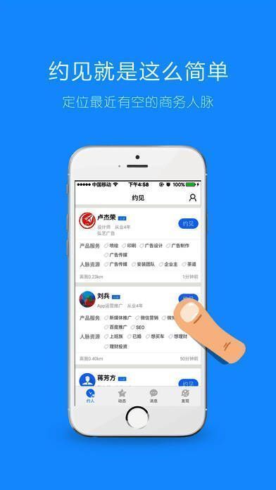 知脉上汇聚了城市里不同行业的人,并基于LBS定位离你最近且有空的人;
