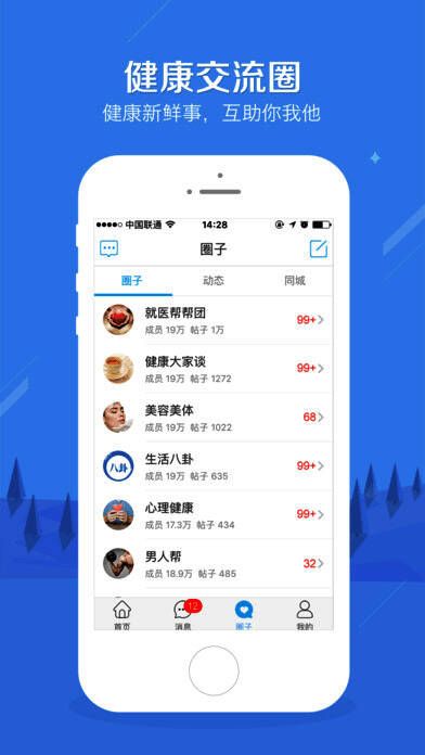 健康圈子:健康交流社区,与同科室、同疾病的病友及医生进行互动,不定期邀请知名专家参与互动;