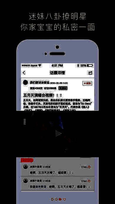2、明星粉丝互动APP,包括明星资料、活动发布、圈子、明星周边等;