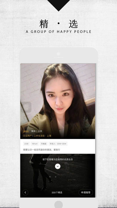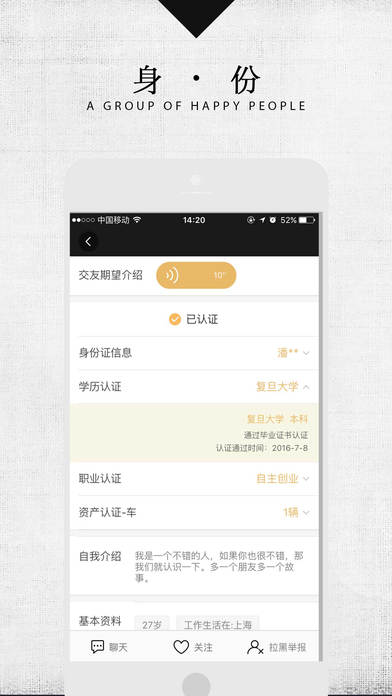 1、“贵圈club”有着极为严格的身份、学历和资产审核,最大限度地保障了平台的真实和高品质的用户构成。“贵圈club”的用户大多是都是外企或者大型企业的高级白领,或者是年轻的创业者、医生、律师、媒体人等较高社会地位和收入等人群。年轻而高级的用户大量集中在“贵圈”,这是其它的类似的高端社交平台所不具备的。