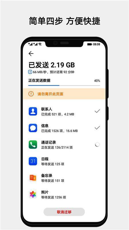 华为手机克隆不仅限于基础的联系人和短信迁移,它还支持包括应用程序、照片、视频、音乐、电子书、文档等多种文件格式的传输。总计可迁移多达14种不同类型的数据,满足用户从个人生活到工作办公的全方位需求。此外,该工具无需依赖网络连接,即使在没有Wi-Fi或移动数据的环境下也能顺利进行传输。