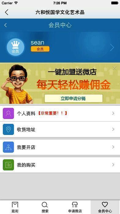 3、微店管理:可以申请一个微店,自己可以发展为分销商,然后推广商品,每卖出一个商品赚取佣金,对佣金取现;