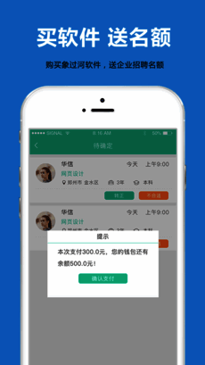 【管理方便】查看求职简历,群聊实时沟通,现场一键录用,人员批量签到,线上结算更快捷;