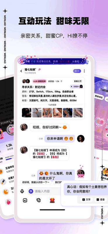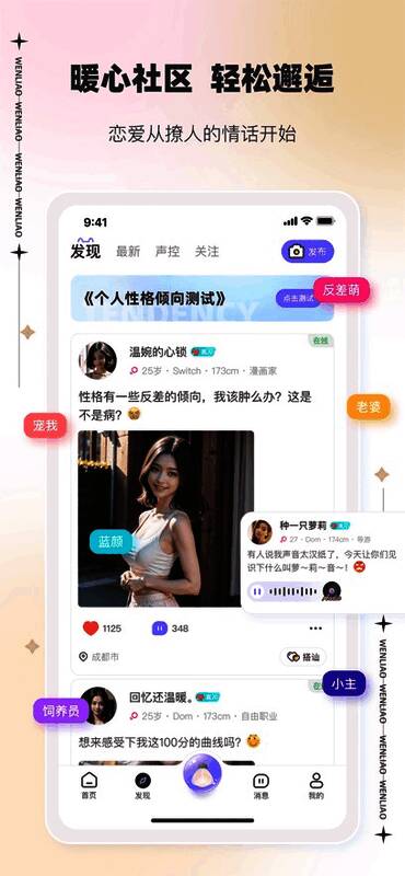 文撩不仅提供基础的配对服务,还融入了多种趣味元素。例如“月亮长老配对”功能可智能推荐最契合的对象;支持随机麦克风连接、音箱互动、窃听等新颖玩法,增强用户之间的实时互动体验。无论是留言墙的真诚表达,还是文学社区的深度交流,都让用户在轻松氛围中结识更多有趣灵魂。