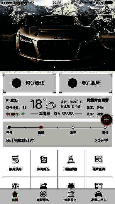 奥迪官方认证的行车辅助和车主车辆服务的软件《My Audi》app,满足所有奥迪车主的一切生活日常出行所需,奥迪车辆的一切资讯我们有,奥迪车辆的信息我们有,奥迪车的二手车资讯我们有,各种车辆保养维修等服务均可在app上预约时间,随时到店,便捷生活,快乐出行。