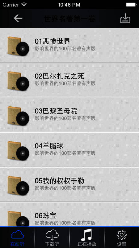 有声阅读,与您一起听世界!喜欢巴尔扎克,想要体验《钢铁是怎样炼成的》,希望倾听《静静的顿河》,幻想跟《简·爱》一起经历《苦难的历程》,或者与《安娜·卡列尼娜》共度别有风味的《乡村礼拜日》……听经典世界名著,体验经典文化大餐! 百位演艺明星配音配乐,百部经典名著另类诠释。