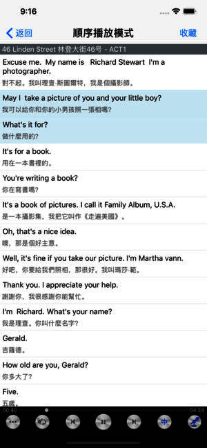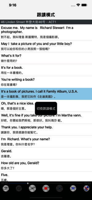 本APP每课都配有详细的中文字幕,并配以强大的可跟读复读的播放器,单词即按即查(联想记忆、常用词组、同义词辨析等),课文内容轻松点读、口语跟读练习、支持后台播放、多种播放学习模式。