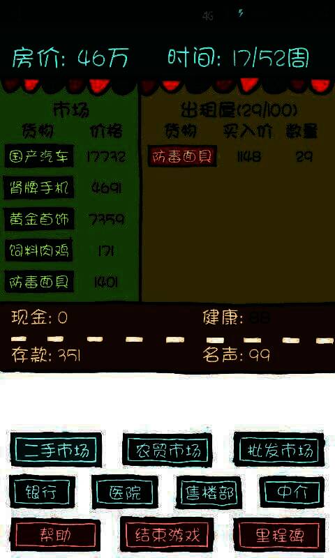 买房记是一款非常有趣的文字模拟经营类游戏,游戏玩法很简单,你需要在游戏中通过低买高卖各类道具赚取一定的钱,你每天都可以查看房价的涨幅。通过自己的精打细算,逐渐积累金钱。