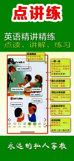 针对中小学语数外教材的手机点读软件,内容跟教材一致,使用起来就像直接在教材上使用一样。《三巧点讲练》App,“教”和“学”完美融合的点读学习机平台。《点讲练》学习效果好,远超普通点读机!深度讲解单词,包括读音、记法、用法;全面讲解课文难句、重点、语法;准确翻译课文;详尽解析课文练习,提供标准答案。《点讲练》的英语老师为外国语大学教授,发音标准,讲解深入浅出,所讲知识点易学易懂易记。