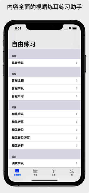 1、练习内容非常全面,包含了单音、音程、和弦和调式等多种练习科目。