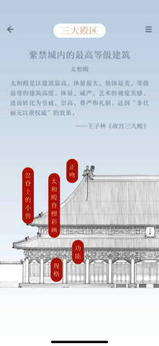 在这里建筑本身很重要,建筑所承载的信息一样宝贵,所以应用程序划分为昼夜两个模式,白天介绍宫殿建筑、晚上讲述宫廷历史。