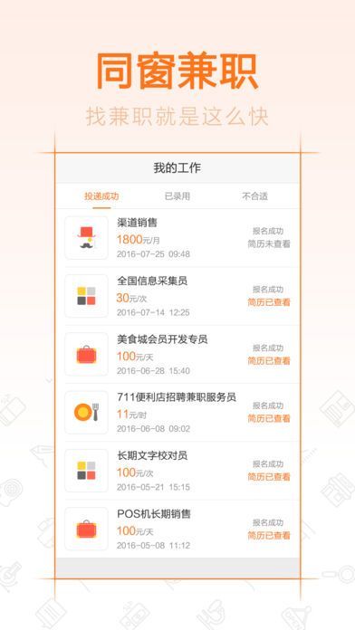 同窗兼职,是天津九零同窗科技信息有限公司开发的一款针对大学生兼职的APP。企业目标把同窗兼职APP打造中国大学生最好的兼职体验平台。产品囊括各种大学生兼职类型,包括商业兼职,公益兼职,旅行兼职,入驻企业全部实名认证,保证商家信息及职位信息的准确性,支付宝担保交易,让学生放心。企业未来希望为中国大学生提供一个真实、可靠、安全的兼职信息平台。解决全国3000多万在校大学生兼职难的问题。同时,公司也面向各大型企业及发展中的中小型公司提供大学生兼职人才信息服务。