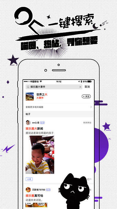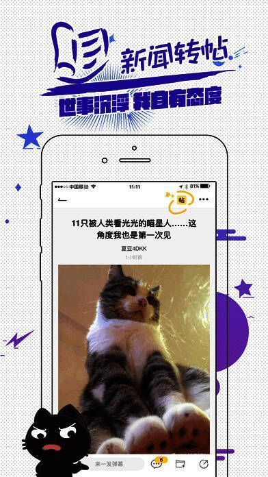 《唔哩头条》是社交类的软件;在软件内小编看到了许多软文;在看到不同得类别如热点、八卦、二次元等等,每天24小时不间断的更新绝对有格调,可评论可点赞可转发;还有最后一个亮点就是猫圈广场,用户有可能会碰见那个TA。